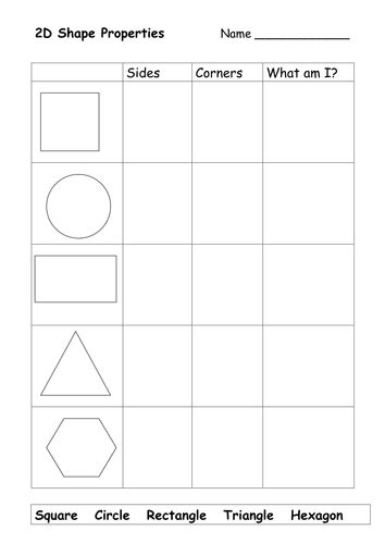 Fits with lower ks2 new curriculum. Trianglesrectanglessquares circles hexagonsfor each 2d shape, students must write down the individual properties and distinguishing features. We have a wide selection of worksheets on 2d shapes, including symmetry worksheets, naming 2d shapes, shape riddles and puzzles, and sheets about the properties of 2d shapes.